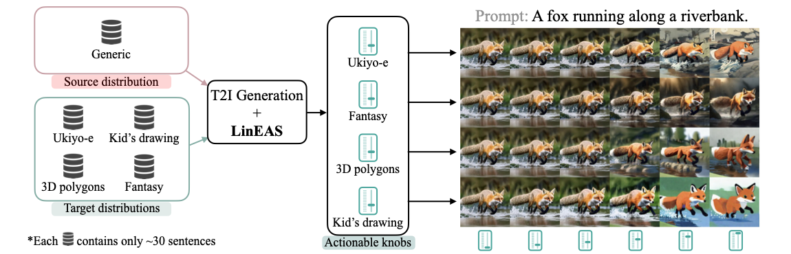 - In The Thirty-ninth Annual Conference on Neural Information Processing Systems, 2025TL;DR: We introduce LinEAS, a method for controlling generative models by learning affine transformations on internal activations using optimal transport theory. Training end-to-end across all layers with just 32 unpaired samples and sparse regularization for automatic neuron selection, LinEAS achieves effective toxicity mitigation in LLMs and style control in text-to-image models without retraining