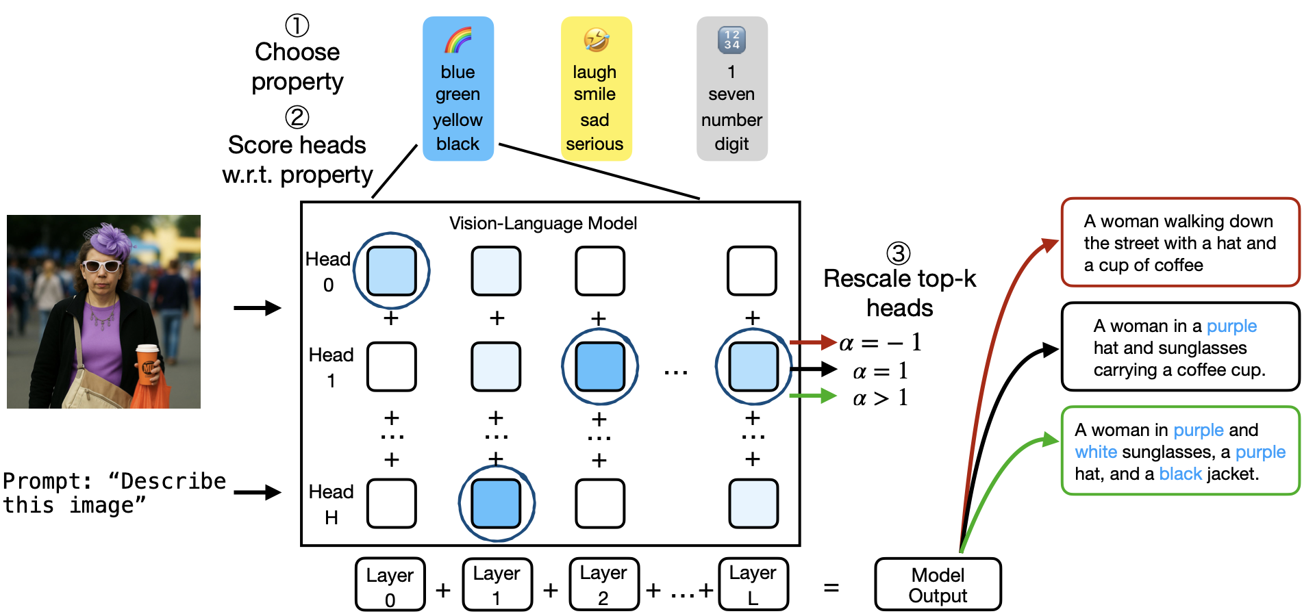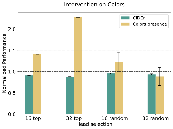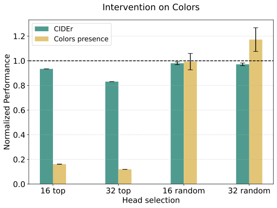 - Inhibitory intervention (\(\alpha = -1\)): Almost completely removes color or sentiment words from captions while maintaining overall caption quality (CIDEr score).