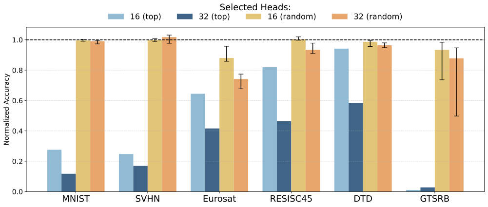 Moreover, head selections exhibit semantic structure: datasets with related content (MNIST/SVHN for digits, EuroSAT/RESISC45 for remote sensing) share more specialized heads, and cross-dataset interventions reveal this structure.