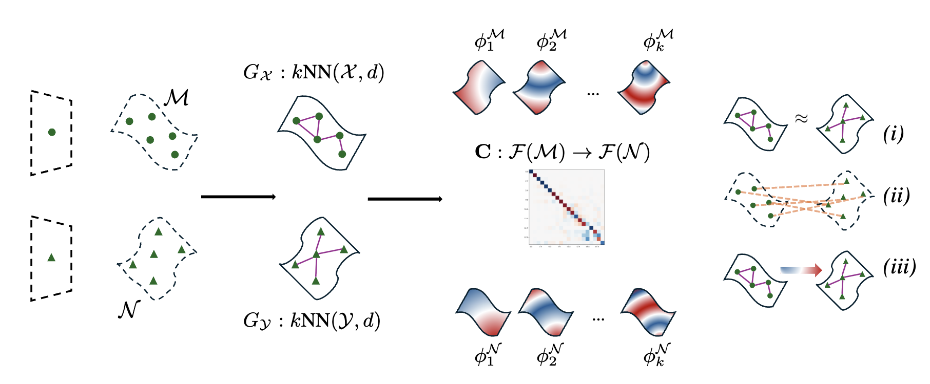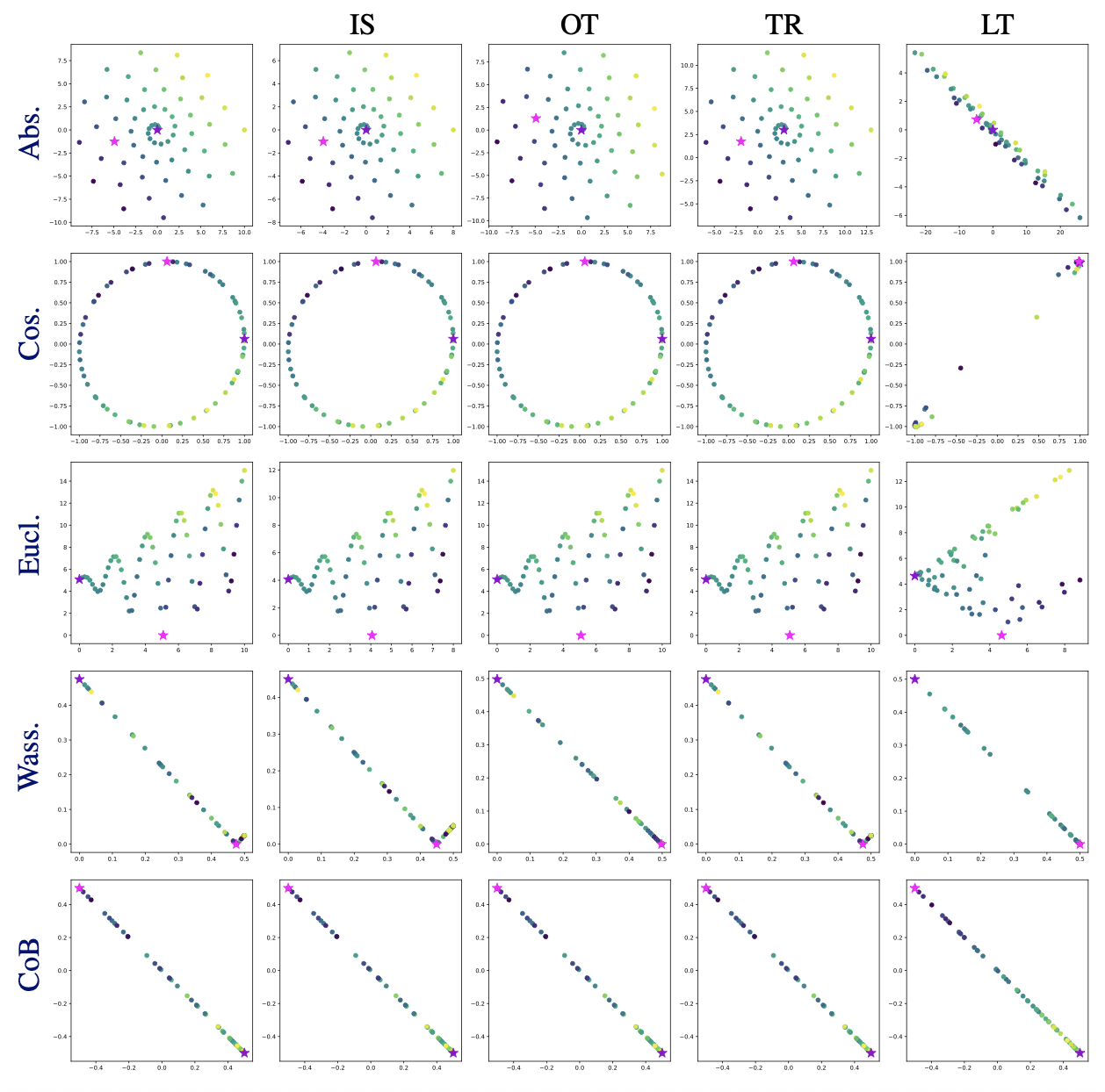 In International Conference on Learning Representations, 2024TL;DR: We construct a product space of multiple relative representations, each computed using different distance metrics (Cosine, Euclidean, L1, L∞), to capture complex transformations between latent spaces without committing to a single invariance a priori. This consistently matches or exceeds the best single metric across vision, text, and graph domains in zero-shot model stitching tasks. - In ICML AI4Science Workshop, 2024TL;DR: We transform the computationally intractable Gromov-Wasserstein problem into a scalable, inductive solution by learning embeddings that map domains into a common space where alignment reduces to a single optimal transport problem. This enables handling 45,000+ samples where standard solvers fail beyond 25,000, with extensions to non-metric structures through rank-based matching.