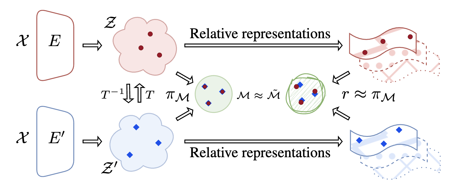 In International Conference on Learning Representations, 2023TL;DR: We introduce relative representations that make neural network latent spaces invariant to training stochasticity by encoding data points relative to anchor samples using cosine similarity. This enables zero-shot model stitching across different random seeds, architectures, languages, and datasets without any training. - In Advances in Neural Information Processing Systems, 2023TL;DR: ASIF creates multimodal models without any training by using relative representations computed from frozen pre-trained unimodal encoders and a small collection of image-text pairs. This training-free approach achieves competitive zero-shot classification with 250× less data than CLIP, while providing built-in interpretability.